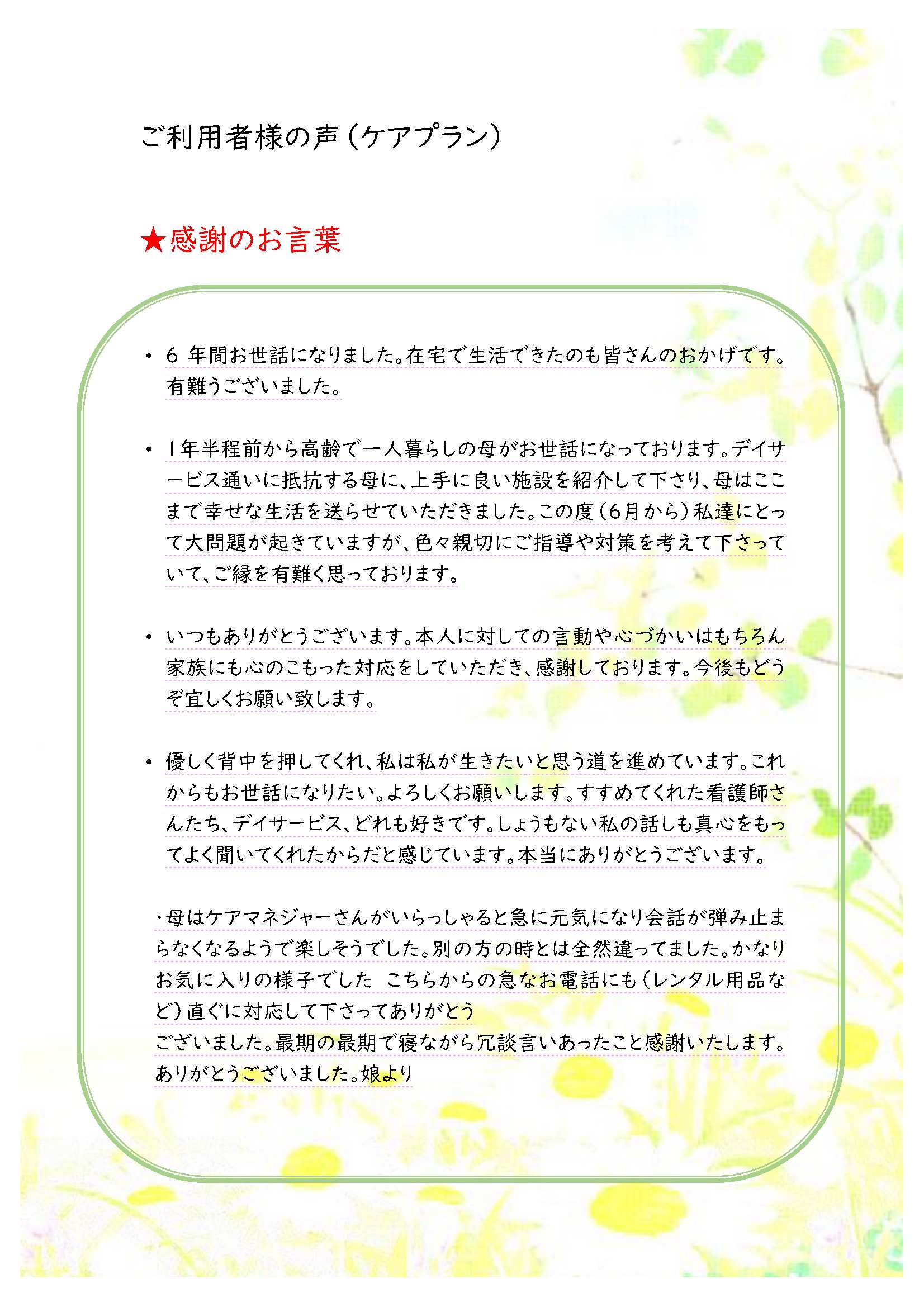 当事業団では、介護保険法に関する基準省令に基づき、平成16年度から、事業所単位で年1回サービスの質の評価を行っています。事業所が自ら行う自己評価と合わせて、ご利用者さまに「質の評価に関するアンケート」の記入にご協力いただき、その結果をもとに、サービスの質の向上に努めています。