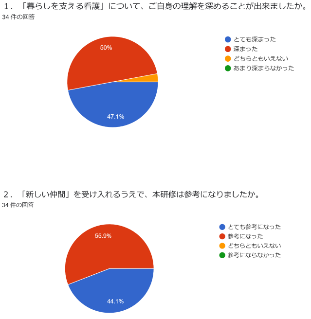 グループワークでは、職員育成に関する相互の悩みを話し合えており、訪問看護職員の教育や育成育成について、理解を深めることができたと回答して頂き、好評を得られました。